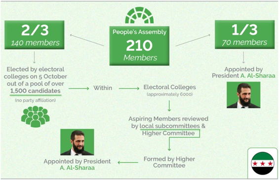 選挙を注視していた者の間でも、見解は分かれた。一部の人が、アサド政権時の厳格に管理された見せかけの選挙からは進歩したと考えている一方、他の人たちは、選挙プロセスとその結果を批判し、納得感を示していない。主な懸念点は、大統領権の程度である。議席の3分の1が直接大統領によって選出され、残りの議席が、大統領の指名する委員会の監視の下、不透明なプロセスによって選ばれる。脆弱な監視機構および曖昧な選出基準は、特に移行期において政治的操作の懸念を提起する。