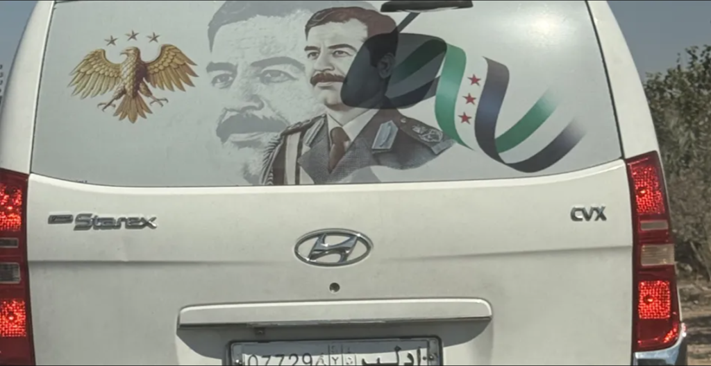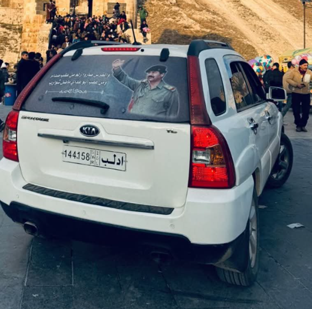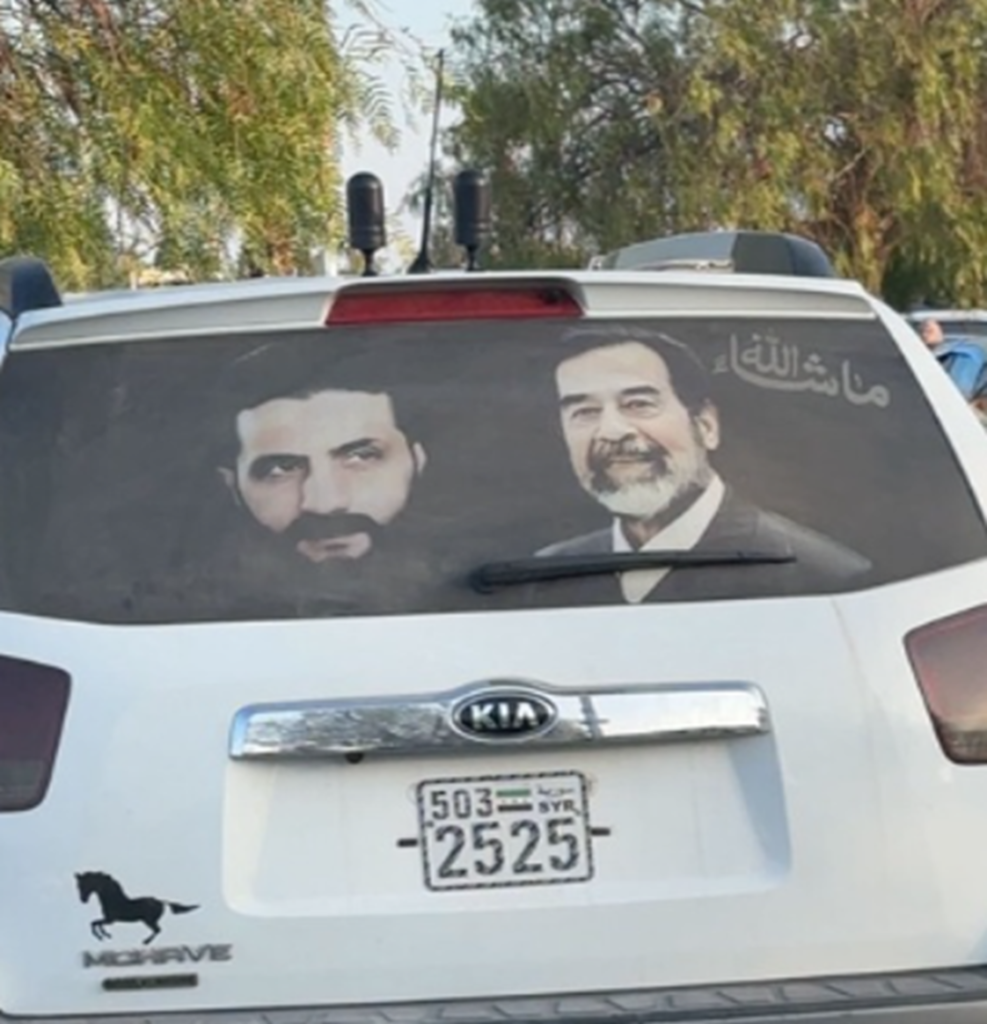 こうした内憂外患にさらされているシリアでは現在、興味深い事象が起きている。1979年から2003年までイラクの指導者だったサッダーム・フセインの図像が拡散しているのだ。こうした図像は、X(旧Twitter)やFacebookといった主要SNS上において拡散されているだけでなく、車の窓ガラスや(al-Kawākibī[2025])、街中でも見られる(画像1を参照)。