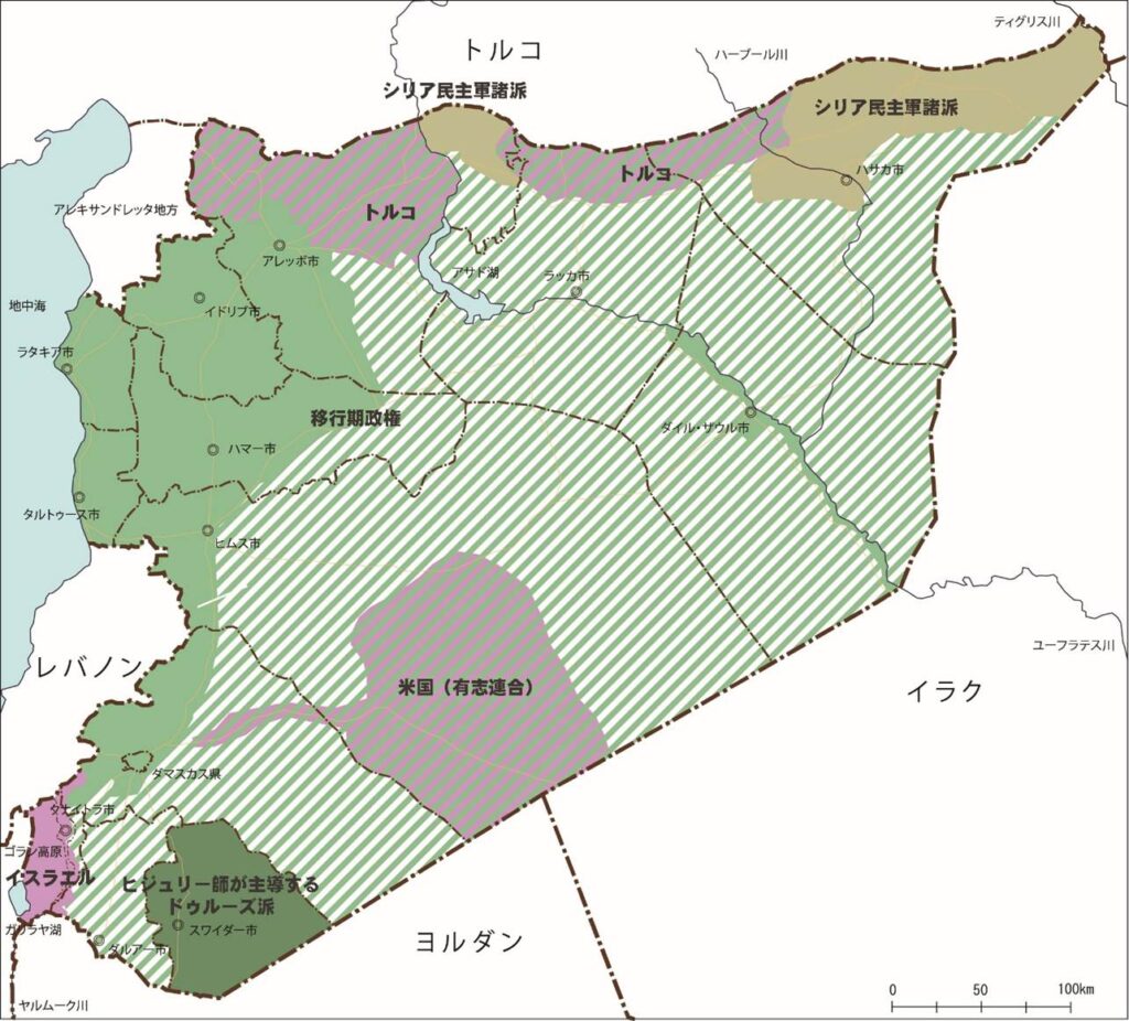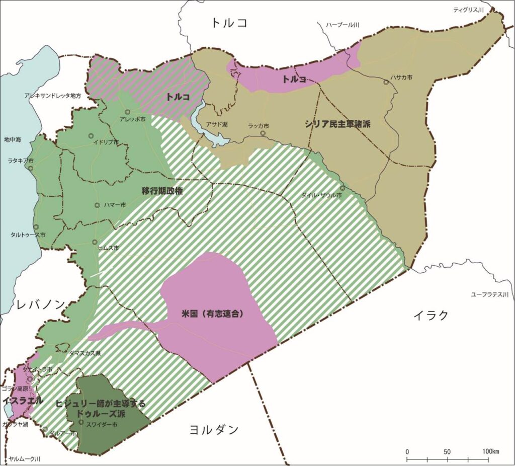 2025年1月初め、移行期政権の軍部隊は、シリア民主軍諸派の支配下にあったアレッポ市シャイフ・マクスード地区およびアシュラフィーヤ地区に進攻した。これを契機に、移行期政権はシリア民主軍諸派の支配地域に対して大規模な攻勢を展開し、1月末までにアレッポ県東部、ラッカ県、ダイル・ザウル県東岸、ハサカ県南部を掌握することに成功した(図3参照)。