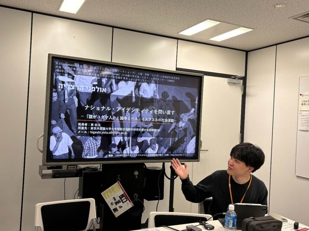 1人目の報告者である東京外国語大学大学院総合国際学研究科博士前期課程の東 佑太氏がまず、「ナショナル・アイデンティティを問い直す:『誰がユダヤ人か』論争とベネ・イスラエルの社会運動」と題した報告を対面で行い、質疑応答が行われました。