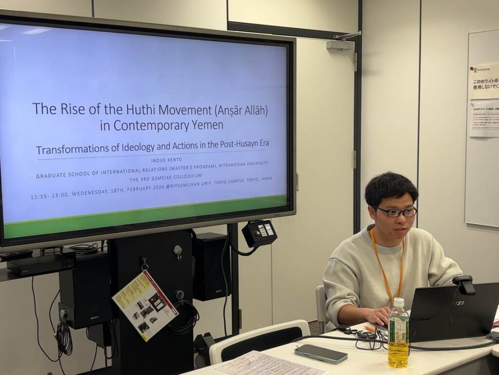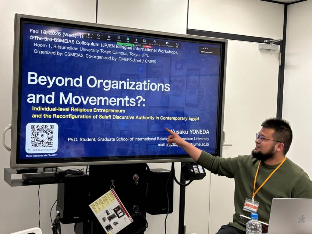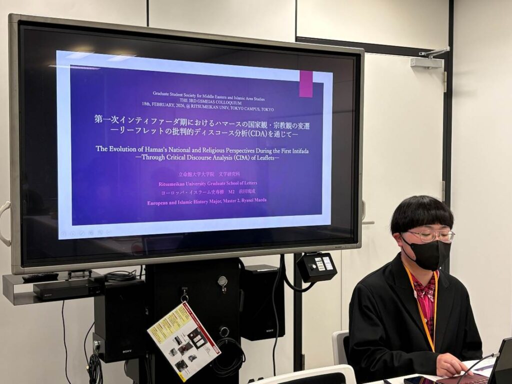 2026年2月18日(水)、中東・イスラーム地域研究 院生研究会(Graduate Student Society for Middle Eastern and Islamic Area Studies:GSMEIAS)が主催する研究報告会(第3回GSMEIAS研究報告会[日英バイリンガル国際ワークショップ:各自発表は日英どちらかの言語、質疑応答は両言語])が、現代中東政治研究ネットワーク(CMEPS-J.net)と立命館大学中東・イスラーム研究センター(CMEIS)の共催のもと、立命館大学東京キャンパス(東京都千代田区)にて対面・オンラインのハイブリッド方式で開催されました。会には合計で11名の若手研究者らが参加し、研究報告と討論が行われました。