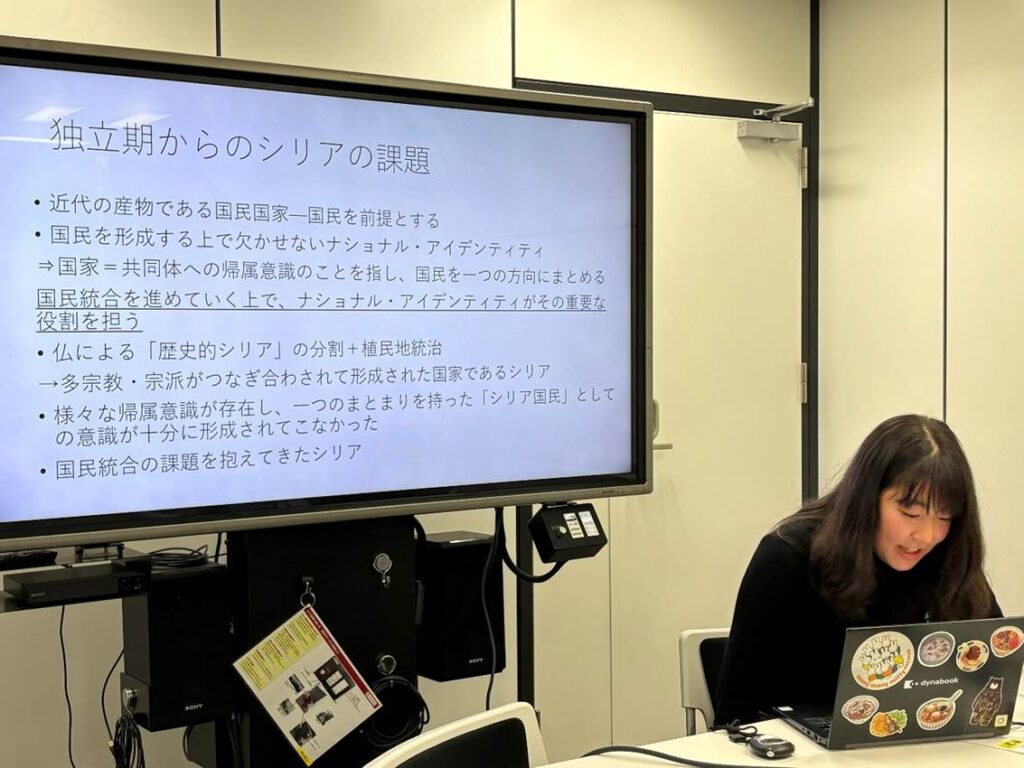 続いて、3人目の報告者である立命館大学大学院国際関係研究科博士課程前期課程の藤永 凜氏が「内戦後のシリア新政権によるナショナル・アイデンティティの再構築:改訂教科書の内容分析から」と題した報告を対面で行い、質疑応答が行われました。
