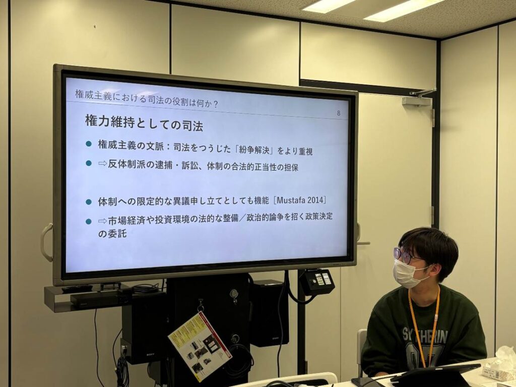 まず、1人目の報告者である上智⼤学⼤学院グローバル・スタディーズ研究科博士後期課程の久永 優吾氏が「中東における憲法秩序再考」と題した報告を対面で行い、質疑応答が行われました。