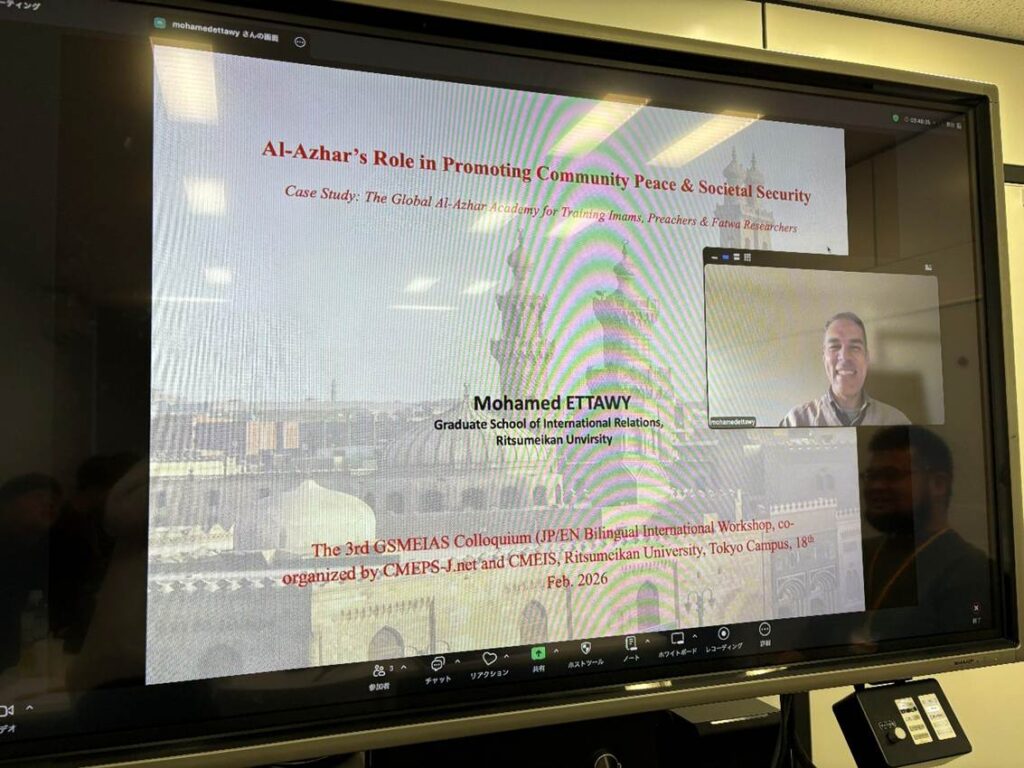 続いて、2人目の報告者である立命館大学大学院国際関係研究科博⼠課程後期課程のETTAWY Mohamed氏が“Al-Azhar’s Role in Promoting Community Peace and Societal Security: A Case Study of the Global Al-Azhar Academy for Training Imams, Preachers, and Fatwa Researchers”と題した報告をオンラインで行い、質疑応答が行われました。